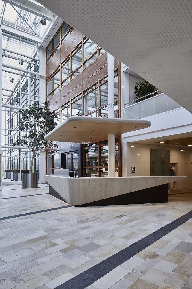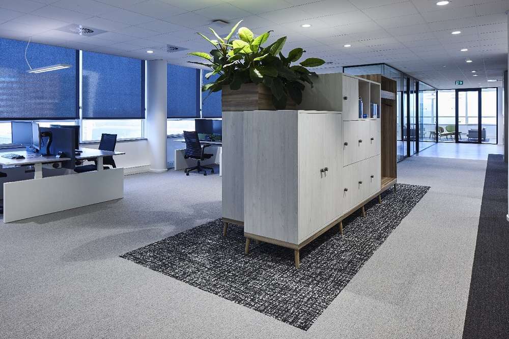 We maakten gebruik van een luxe Light Oak vinylvloer van Interface. Deze vloer komt uit de collectie Textured Woodgrains. De lichte vloer past perfect bij de donkere kleuren van de andere vloeren en het interieur. Deze luxevinyltegel heeft een voelbare houtstructuur en is daardoor niet van echt hout te onderscheiden. De tapijttegels sluiten naadloos aan bij deze vloer, waardoor het een mooi geheel is geworden.