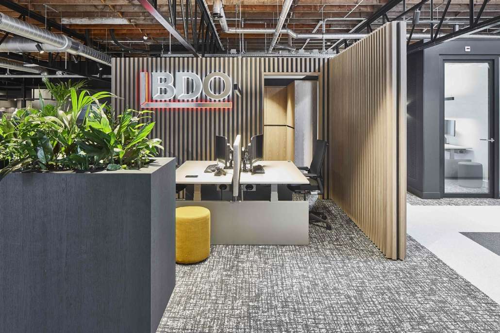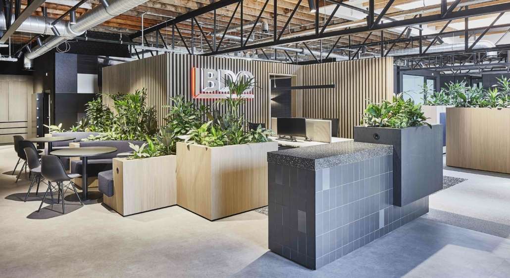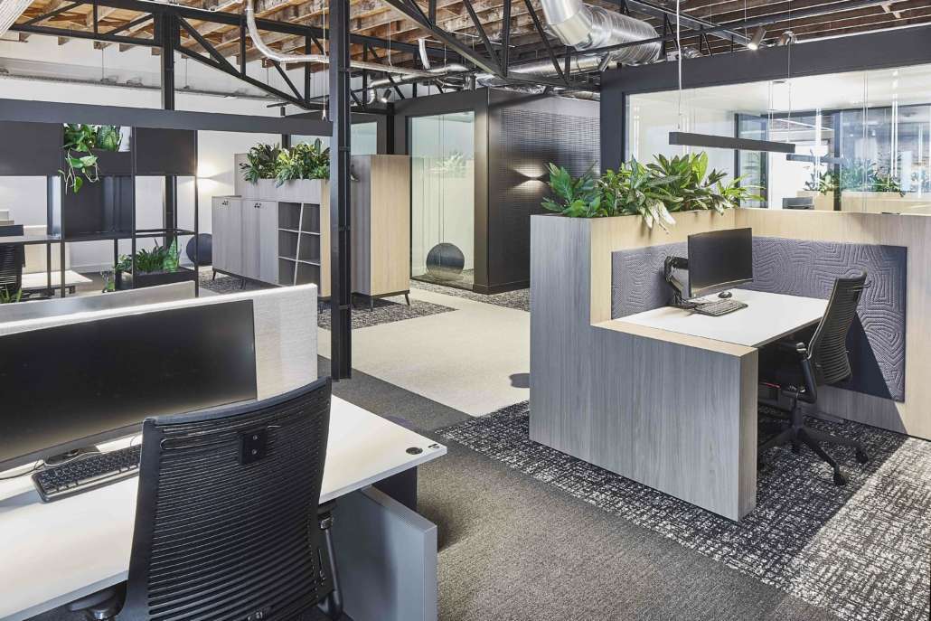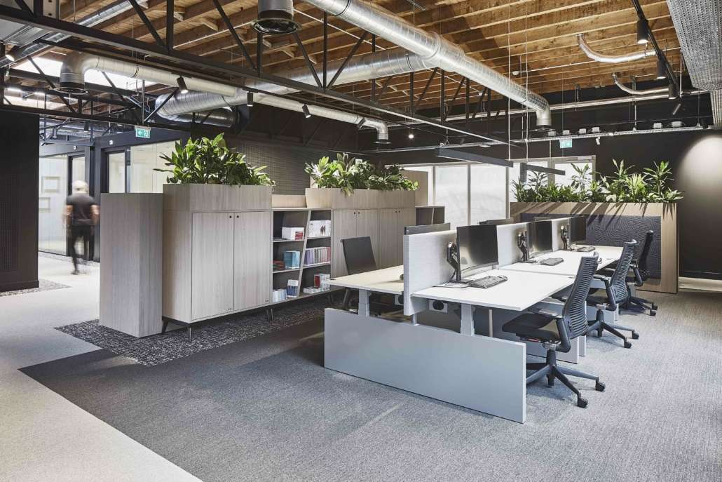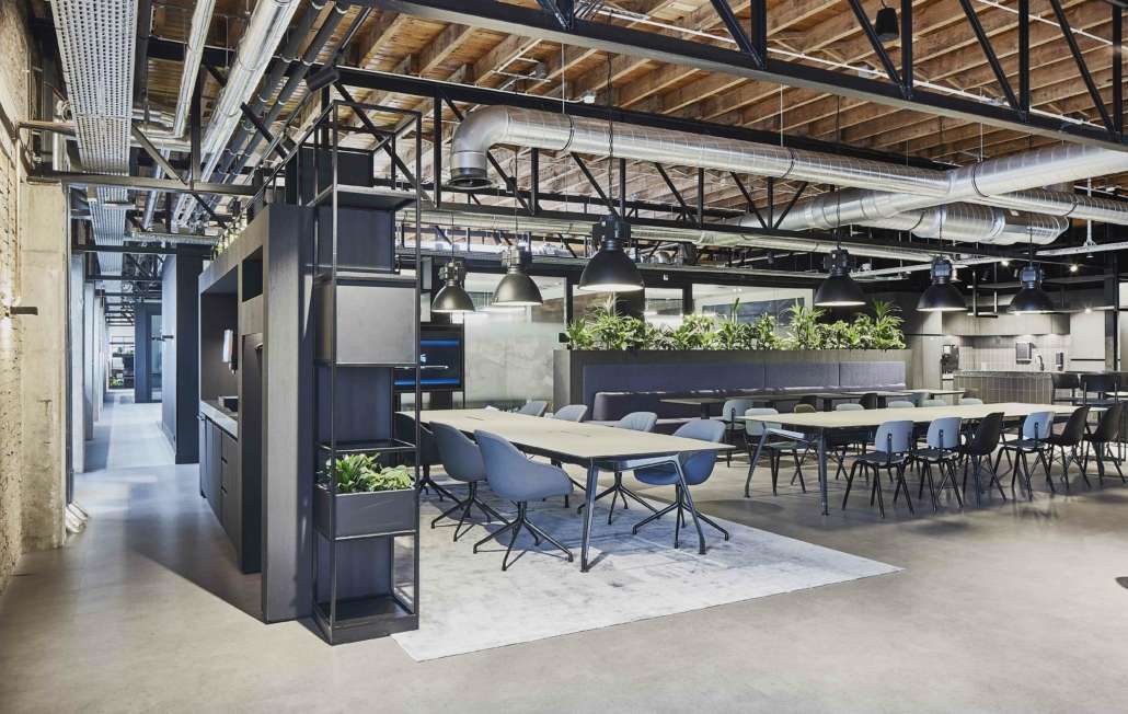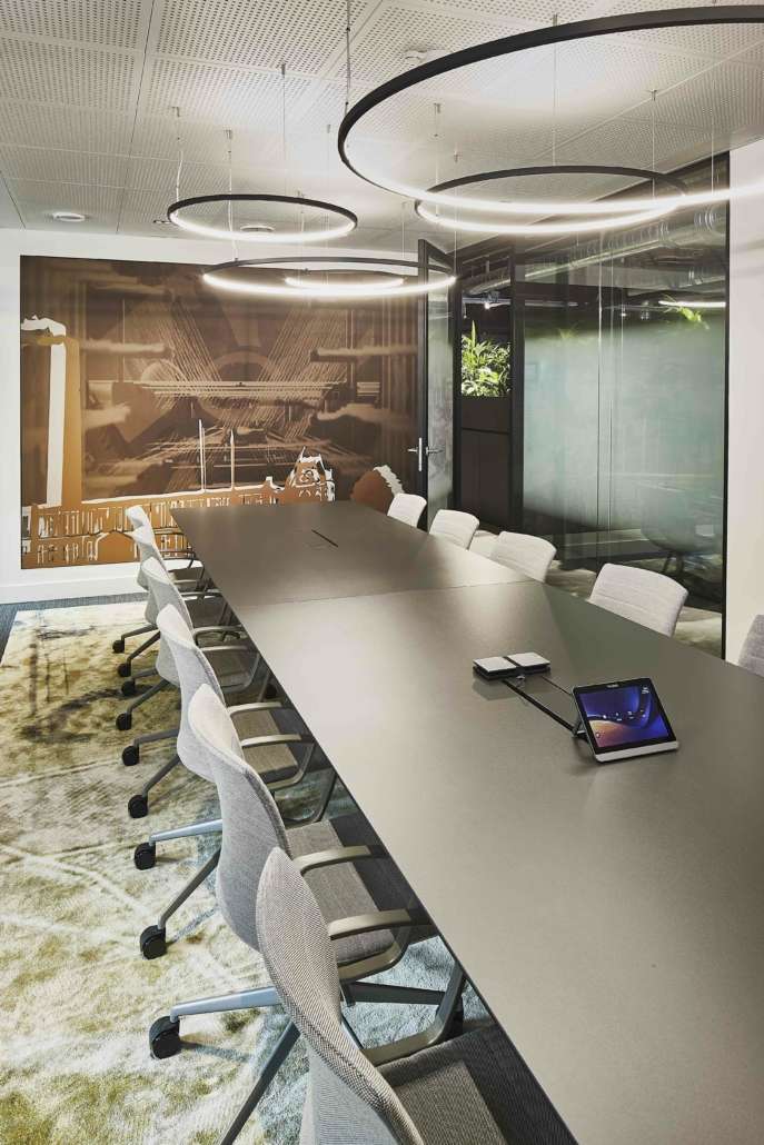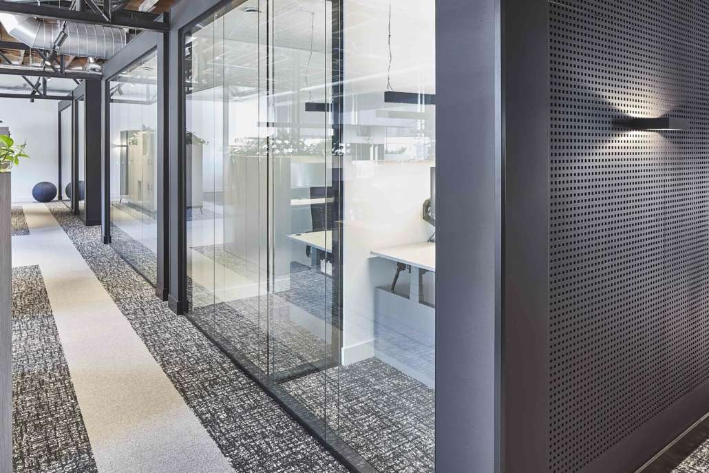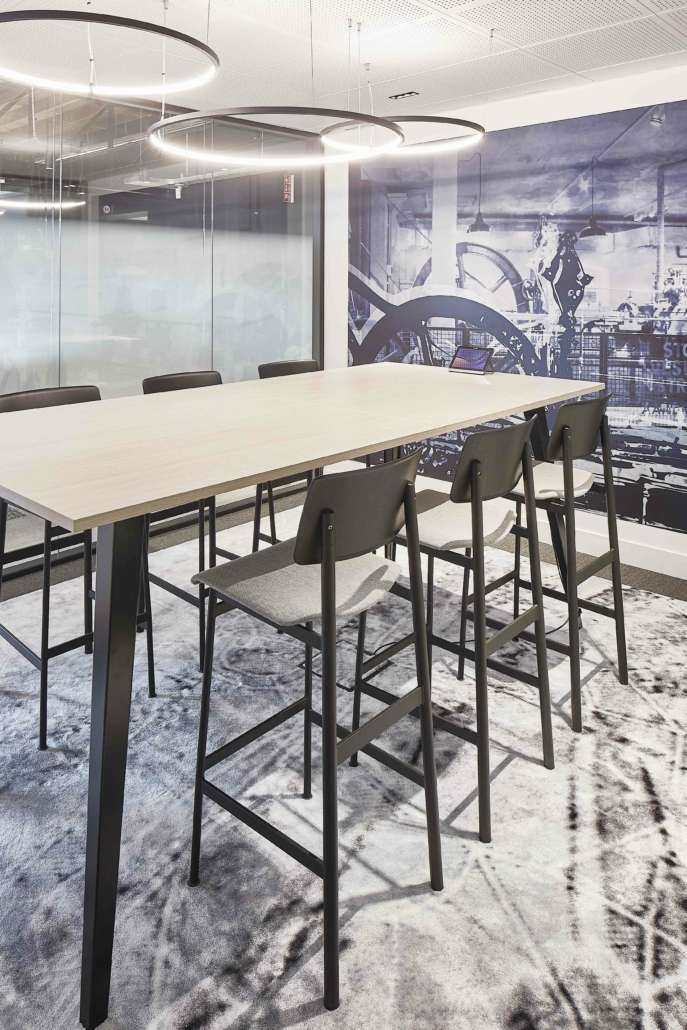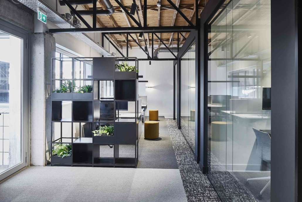 In het grootste deel van de ruimte, 850m2, hebben we de World Woven en On Line tapijttegels van Interface gebruikt. De World Woven tapijttegels in de kleur Charcoal Dobby zijn uitgekozen door zijn diepe, getextureerde kleur, met de lichte On Line tapijttegels in de kleur Pigeon als subtiele tegenhanger. Voor enkele donkere accenten zijn er van dezelfde collectie tapijttegels in de kleur Pepper gebruikt. Deze combinatie zorgt voor een rustig en tegelijk dynamisch vloerbeeld dat perfect past bij het open, moderne kantoorinterieur.