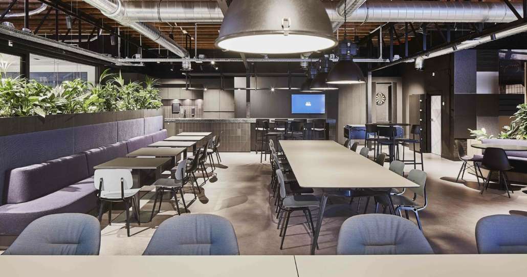 In de kantine hebben we 200m2 Luxe Vinyl Tegels van Interface in een betonlook gelegd. Een vloer die prachtig aansluit bij de industriële en ruime uitstraling van de ruimte. De betonlook zorgt voor een strakke, moderne basis, terwijl het materiaal zelf warm, comfortabel en onderhoudsvriendelijk is. LVT is kras- en slijtbestendig, dus ideaal voor een ruimte waar dagelijks veel mensen rondlopen en stoelen over de vloer bewegen. Het resultaat is een vloer die de stoere uitstraling van echt beton combineert met het gebruiksgemak van een duurzame projectvloer.