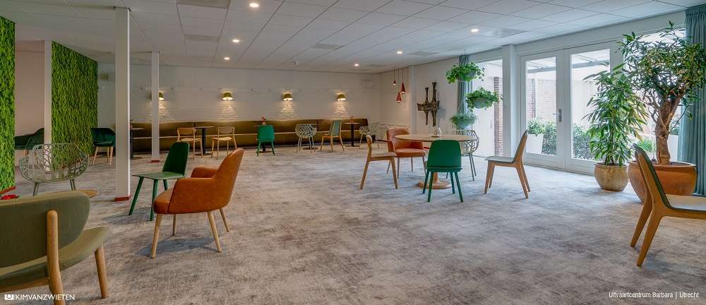 In de ruimte met de PVC vloer hebben we in cirkels tapijt van DoD gelegd met een kleurrijk bloemenpatroon. Dit geeft de ruimte een unieke uitstraling. Daarnaast hebben we in diverse andere ruimtes ook 375 m² tapijt gelegd in verschillende prints en kleuren.
