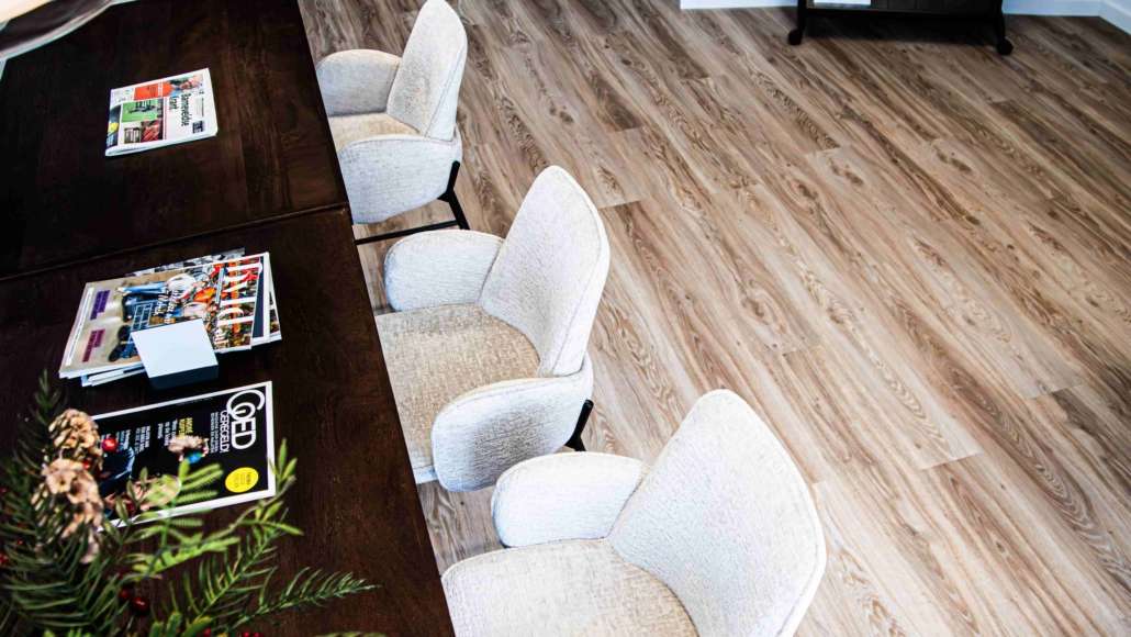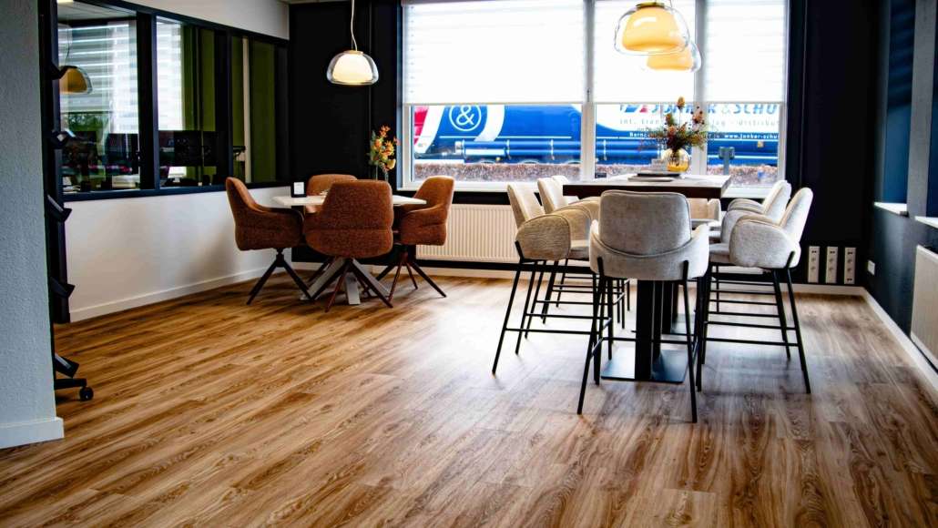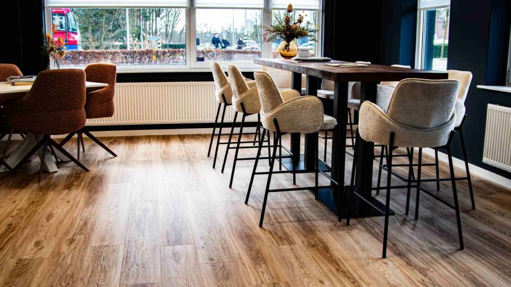 In de algemene ruimtes is er gekozen voor een loose lay PVC vloer van Moduleo in de kleur Blackjack Oak 22229. De vloer heeft een warme houtlook en zorgt voor een uitnodigende en professionele uitstraling. Het is een rustige basis die goed samenwerkt met het moderne interieur.
