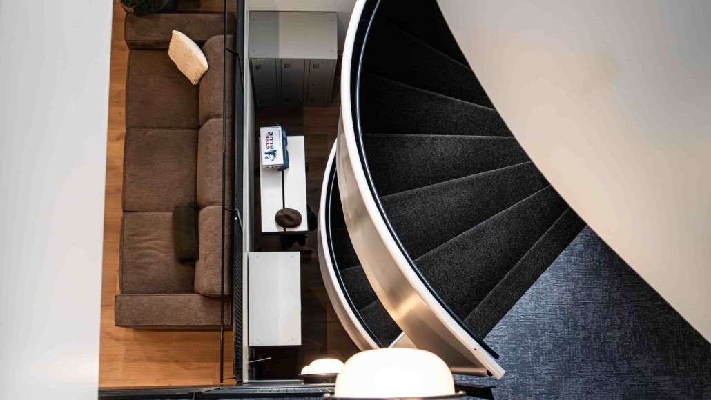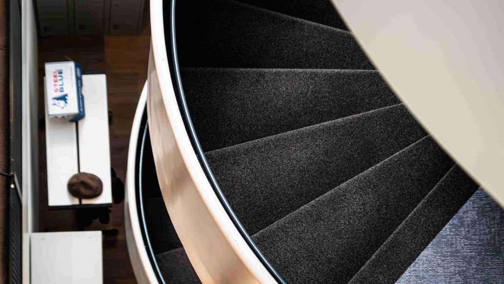 Een bijzonder onderdeel van dit project is de stalen wenteltrap, die we hebben voorzien van ondertapijt en tapijt. Stalen trappen hebben van nature de eigenschap om luidruchtig te zijn wanneer er gebruik van wordt gemaakt, wat in een werkomgeving als storend kan worden ervaren.